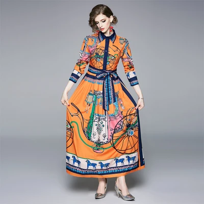 Hot Sale High Quality Luxury Brand Designer Runway Dress New 2019 Autumn Women's Horse Print Long Maxi Ankle
