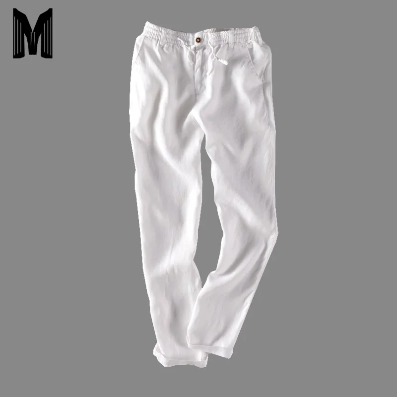 100%Linen Men Casual Pants Solid White Breathable Fashion Comfortable Full Length Mens Pants Y1902